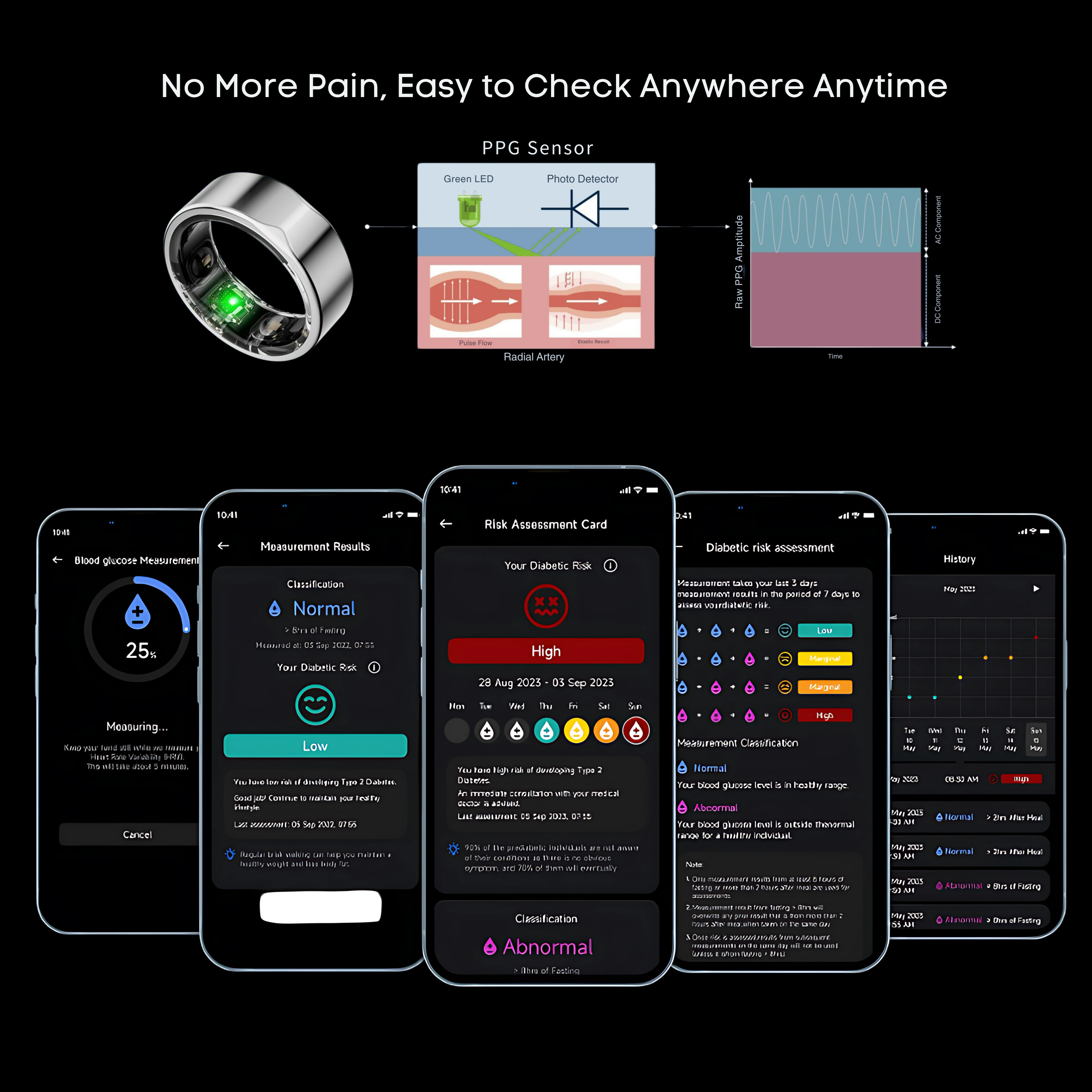 The Glucose Smart Ring™ provides an easy-to-understand feedback system to help you monitor changes in your glucose levels over time. This allows you to observe patterns and identify trends that may affect your health.