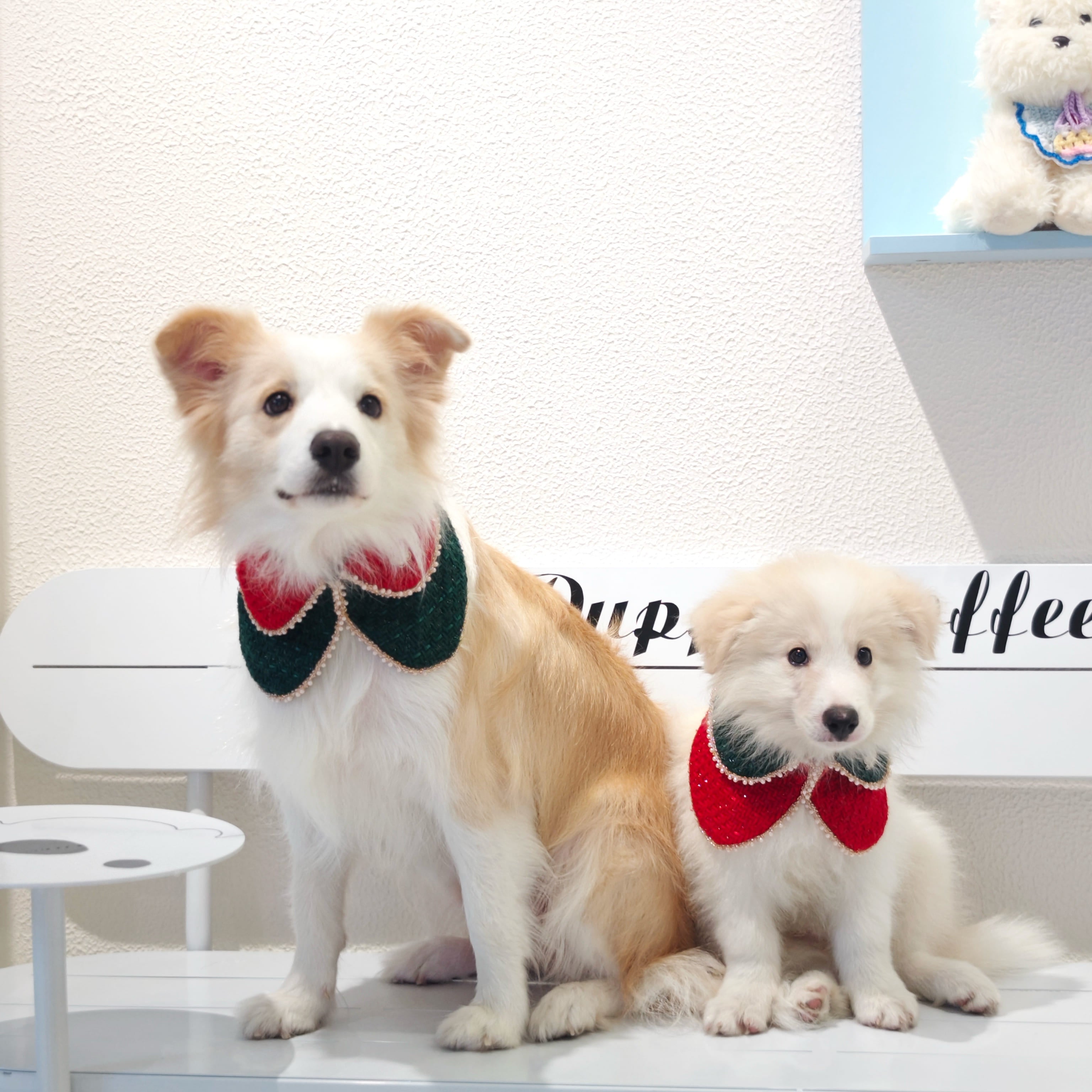 Celebrate the magic of Christmas with the Avery Handmade Red & Green Bandana, designed for both dogs and cats. Adorned with delicate pearls and a charming interchangeable brooch, this festive piece blends elegance and holiday cheer. Easy to wear with a soft Velcro closure, it’s perfect for Christmas gatherings, family photos, and joyful parties.