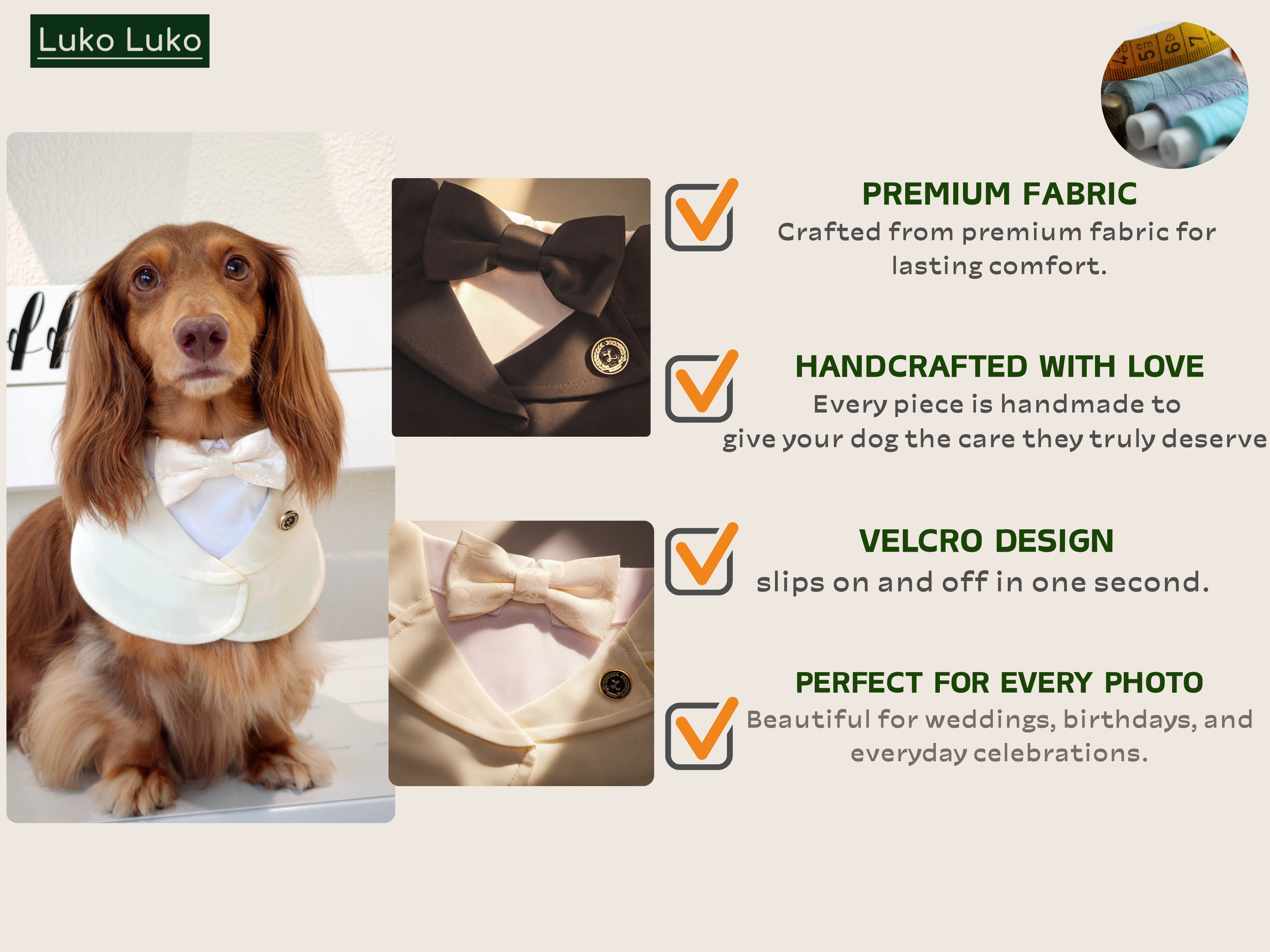 This classic beige/black suit brings sophistication to any occasion. Made from premium fabric, it features a comfortable fit with an adjustable Velcro closure for easy wear. Perfect for formal events, photoshoots, and special celebrations. A refined look for stylish pets!